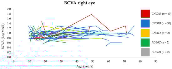 For patients with variants in CNGA3 and worsening of BCVA, this outcome could also be explained by cataract, so in our study, a progressive phenotype only attributable to ACHM was only seen in patients with variants in CNGB3 and PDE6C. This finding is consistent with previous findings indicating that progressive cone [11,37] and cone-rod dystrophies [47] are more frequently reported for these two genes.