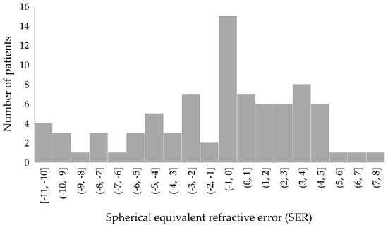 Distribution of the spherical equivalent refractive error (SER) of all patients. Only data for the right eye are shown.