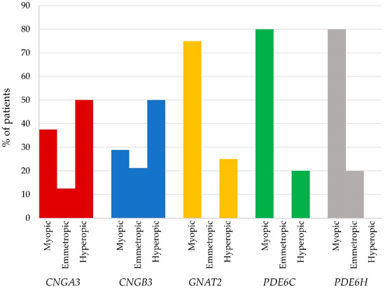 Data on refractive errors at latest follow up was available for 82 patients, with variants in the five different genes (CNGA3 n = 16, CNGB3 n = 52, GNAT2 n = 4, PDE6C n = 5, PDE6H n = 5). Refractive errors varied among the five gene groups (see Figure 5). Patients with variants in CNGA3 and CNGB3 exhibited a range of different refractive errors and in both groups 50% were hyperopic ≥ +0.50 diopters, with 12.5% and 21% respectively being emmetropic. Myopia was apparently more frequent in patients with variants in GNAT2, PDE6C and PDE6H (75, 80 and 80%, respectively). Differences in refractive error with variants in different genes using pairwise analyses was statistically significant when comparing patients with variants in CNGB3 and PDE6H (p-value 0.028). Severe myopia (SER ≤ −6.00 diopters) was observed with variants in all five genes but was more frequently occurring in patients with variants in PDE6H (100%, 4 of 4 patients with myopia), PDE6C (75%, 3 of 4 patients) and GNAT2 (33%, 1 of 3 patients) than in patients with variants in CNGB3 (20%, 3 of 15 patients) and CNGA3 (17%, 1 of 6 patients).