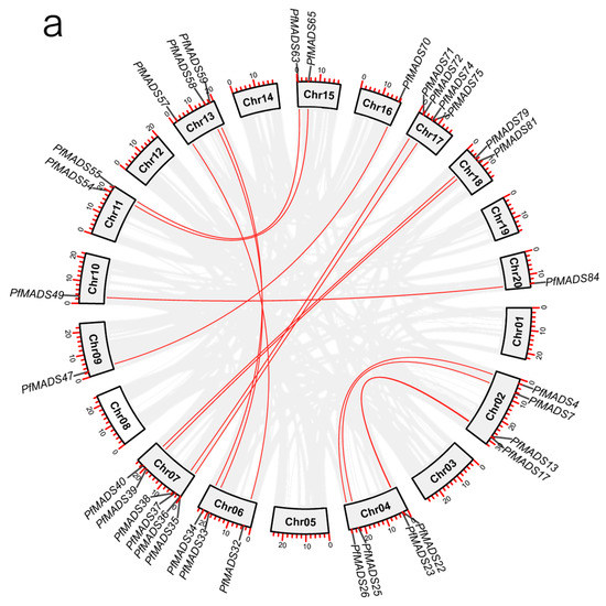 Synteny analysis of MADS-box genes in P. fortunei. (a) The duplication relationship of PfMADS-box genes. Gray lines represent all synteny blocks in the P. fortunei genome, red lines indicate the duplicated PfMADS-box gene pairs. (b) homologous analysis of MADS-box genes between P. fortunei and A. thaliana.