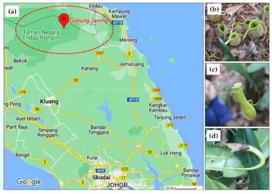 The geographical location (a) of the Nepenthes collected from Bukit Janing, Kampung Peta, Endau-Rompin National Park, Johor, Malaysia (GPS location; 2.529908870220549, 103.41185691378324). Nepenthes species collected: (b) Nepenthes ampullaria, (c) Nepenthes gracilis and (d) Nepenthes rafflesiana.