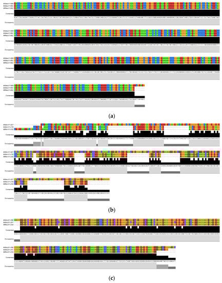 Multiple sequence alignment of rbcL (a), ITS1 (b) and ITS2 (c) barcodes.
