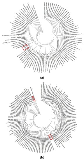 - Tamura, K.; Peterson, D.; Peterson, N.; Stecher, G.; Nei, M.; Kumar, S. MEGA5: Molecular evolutionary genetics analysis using maximum likelihood, evolutionary distance, and maximum parsimony methods. Mol. Biol. Evol. 2011, 28, 2731–2739. [Google Scholar] [CrossRef]