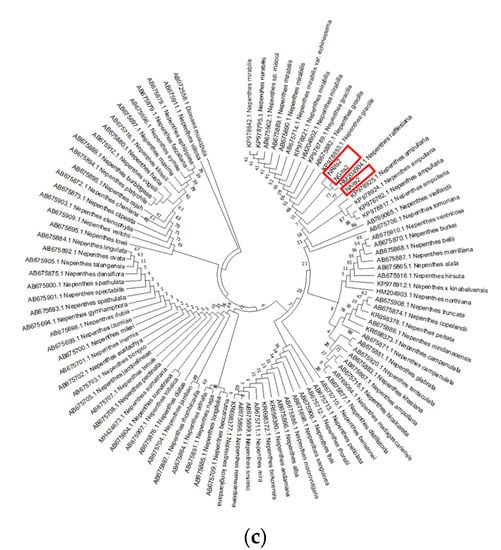 Neighbor joining tree of rbcL (a), ITS1 (b) and ITS2 (c) barcode primers depicting the phylogenetic analysis among N. ampullaria, N. gracilis, and N. rafflesiana (indicated in the red boxes).