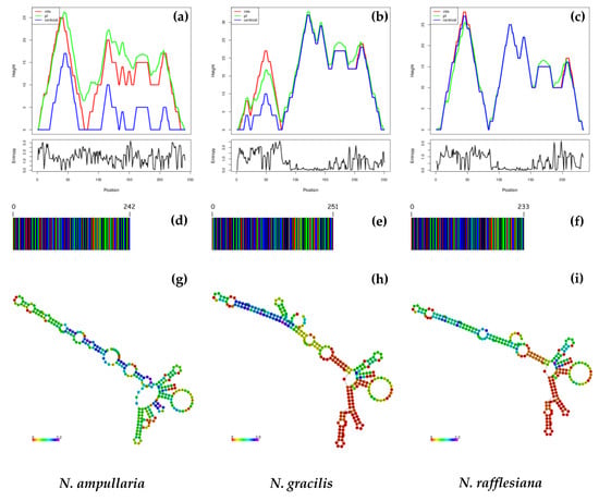 Similarly, ITS1 secondary structure predictions show further variation between the three Nepenthes species. The predicted ITS1 secondary structures of the three Nepenthes showed that each structure had a central ring with different helical orientations (Figure 4g–i). Generally, the secondary structures of NAits1 and NRits1 showed a tighter configuration and pattern similarity despite having a different number of loops on the central ring and along the helices. NGits1, on the other hand, exhibited a more complex structure compared to NAits1 and NRits1, with a bigger central ring, different helix orientations and lengths, varied loop numbers and variation in angles from the spiral. The loop number, position, size and angle from the centroid were distinguishable in all three Nepenthes species.