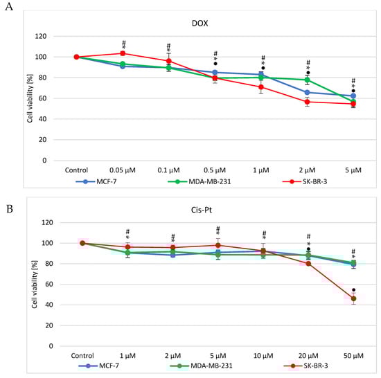 An MTT survival test was involved for DOX (Figure 1A) and cisplatin (Figure 1B) cytotoxicity assessment. Cell treatment was 24 h and, as demonstrated, cytotoxicity effects were concentration dependent. MCF7 and MDA-MB-231 showed a similar survival rate when treated with DOX at 0.05, 0.1, 0.5 or 1 μM (up to ca 20% decrease in survival, relative to control, untreated cells). Simultaneously, treatment of SK-BR-3 cells with the same concentrations of DOX showed significant decrease in survival only at the concentration of 0.5 and 1 μM (up to 20% decrease in survival, relative to control cells). In turn, higher concentration (2 μM) revealed higher resistance of MDA-MB-231 than two other cell lines (survival at 80 vs. 65% in MCF7 and 60% in SK-BR-3), while incubation with 5 μM DOX led to similar survival rate in all three cell lines i.e., 60% (Figure 1A).