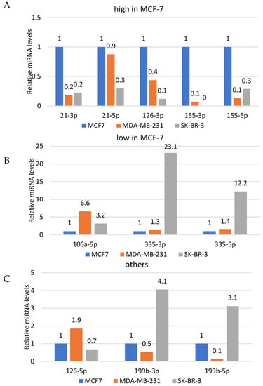 Quantitative assessment of the basal levels of selected miRNAs using qPCR in studied cell lines. miRNAs expression levels were grouped according to their pattern of expression for better representation. The data for all three cell lines (i.e., (A), MCF7; (B), MDA-MB-231; (C), SK-Br-3) were divided into three categories i.e., low, high and others, relative to MCF7 cells, selected as the reference cell line (value “1”).