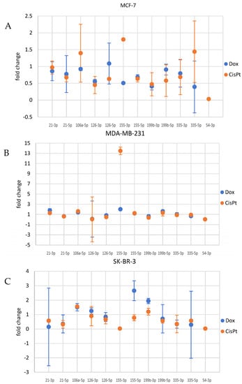 Evaluation of cancer cells response to doxorubicin or cisplatin measured by miRNA levels alterations. All three cell lines ((A), MCF7; (B), MDA−MB−231; (C), SK−BR−3) were subjected to selected miRNAs assessment after treatment with DOX (0.1 μM) or cis-Pt (10 μM) for 24 h. Experiments were performed in triplicates using RT-qPCR assessment. The values represent fold changes, relative to MCF7 cells (used as reference). Values higher than “1” mean induction, while values lower than “1” mean reduction of selected miRNAs levels.