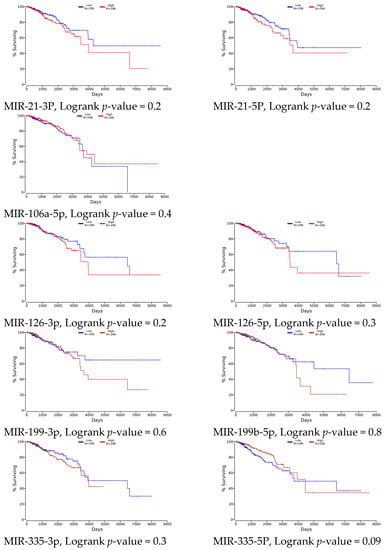 Association between studied miRNAs levels and patients’ survival estimated with the use of miRNA-seq data submitted in TCGA. Lower and upper percentile were set at 30; high and low expression was estimated in 296 cases each group; data analyzed in [40].
