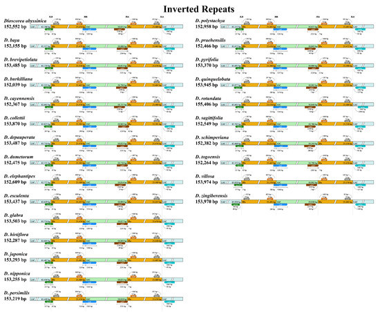 There were four boundaries located between the LSC–IR and SSC–IR regions in all 25 cp genomes. In general, the genes adjacent to the boundaries were similar in all cp genomes analyzed (Figure 3). For the junction between the LSC and IRB regions (JLB), the rps19 gene was found crossing over from the IRB region into the LSC region for all species, except for D. zingiberensis; the rps19 gene of D. zingiberensis was placed in the LSC region and was 48 bp away from the boundary. On the other hand, the trnH genes, which were adjacent to JLB, were located in the IRB region in all species analyzed. For the junction between the SSC and IRB regions (JSB), two genes, trnN and ycf1, were placed next to the boundary. The trnN gene was located in the IRB region, while ycf1 was identified crossing over from the IRB region into the SSC region for all species analyzed. For the junction between the SSC and IRA regions (JSA), trnN was found intact in the IRA region, while the ndhF gene that was located in the SSC region was found crossing over JSA in the cp genomes of 10 species of Dioscorea, including D. baya, D. brevipetiolata, D. collettii, D. depauperata, D. dumentorum, D. glabra, D. japonica, D. nipponica, D. persimillis, D. polystachya, D. pyrifolia, and D. togoensis. For the junction between the LSC and IRA regions (JLA), both the trnH and psbA genes were placed in the LSC and IRA regions, respectively.