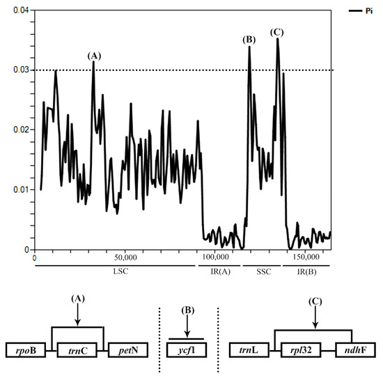 Genome comparison was analyzed in 25 Dioscorea cp genomes, including the four studied species and the 21 Dioscorea species derived from the NCBI database, with D. bulbifera for reference. The results indicated that the IR regions were more highly conserved than the LSC and SSC regions, with variations located on LSC and SSC. Eight variation gaps were observed in the cp genomes alignment; namely, psbA (black arrow, A), trnK-UUU through trnQ-UUG (black arrow, B), trnS-GCU through trnG-UCC (black arrow, C), trnT-UGU through trnL-UAA (black arrow, D), accD through psaI (black arrow, E), psbE through petL (black arrow, F), petD (black arrow, G), and ccsA–trnL-UAG–rpl32–ndhF (black arrow, H). Variation gaps of trnK-UUU through trnQ-UUG, and trnS-GCU through trnG-UCC, were found in all Dioscorea cp genomes. Nine Dioscorea cp genomes had variation gaps at psbA and trnT-UGU through the trnL-UAA regions. Four Dioscorea cp genomes, D. collettii, D. quinquelobata, D. villosa, and D. zingiberensis had nucleotide divergence gaps at the accD through psaI regions. Sixteen Dioscorea cp genomes had variation gaps at psbE through petL region, while nucleotide divergence gaps in petD were found only in D. esculenta. Three Dioscorea cp genomes, D. colletii, D. quinquelobata, and D. villosa, had distinct gaps in the ccsA–trnL-UAG–rpl32–ndhF region. These regions had more than 50% different nucleotide sequences from D. bulbifera, which was used for reference (Figure 4). Nucleotide diversity via sliding window analysis of the 25 cp genomes were compared in the LSC, IR, and SSC regions. Nucleotide variation was higher in the LSC and SSC than the IR regions, as IR regions have low nucleotide diversity. There were three highly nucleotide-divergent regions, called mutational hotspots, located in the LSC (A) and SSC (B, C) regions, showing a Pi value of >0.03 (Figure 5; Supplementary Materials, Table S6). The first hotspot, A, covered the whole trnC-GCA gene; the second hotspot, B, was located on the ycf1 gene; while the third hotspot, C, consisted of the rpl32 gene and the intergenic spacer region ndhF–rpl32.