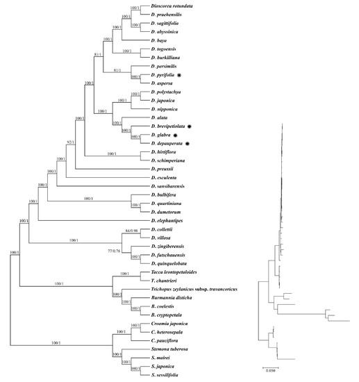 Phylogenetic trees inferred from maximum likelihood and Bayesian inference, showing genetic relationships of cp genome sequences of 37 species representing four different genera (Burmannia, Dioscorea, Tacca, and Trichopus) of Dioscoreales. Seven taxa of Pandanales, representing two genera (Croomia and Stemona), were included as an outgroup. The numbers associated with each node are bootstrap support values for ML (left) and posterior probability values for BI (right). Asterisks denote studied species.