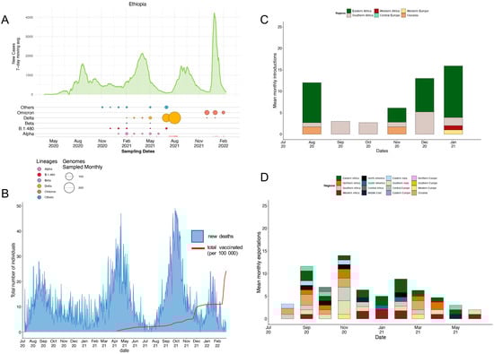 SARS-CoV-2 epidemiology and variant turnover in Ethiopia: (A) 7-day rolling average for the number of new SARS-CoV-2 cases. Others, represented in blue, comprise mostly B lineages, including B, B.1, and B.1.1 lineages. The size of the dot is indicative of the proportion of variant genomes sampled, whereas the rug plot (bottom segment of (A)) shows the distribution of genomes during the sampling period. (B) The proportion of individuals that have received at least one vaccine dose in Ethiopia compared to the number of new deaths that occurred. (C) Summary of the mean number of detected introductions into Ethiopia binned by month for different regions across the dataset. (D) Summary of the mean number of detected exportations out of Ethiopia to different regions binned by month.