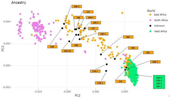 | 131 | L2a1+143 | United States; Cote d’Ivoire; Ghana; Togo; Benin; Somalia | Portugal; Spain; Morocco | Brazil; Uganda; Little part of the Middle East | Egypt; Middle East; Southern Europe |