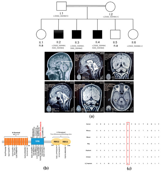 NM_015465.5 (NP_056280.2):p. (Asp1054_Ala1055delinsGlu) deletion in GEMIN5 in three siblings. (a) On the top is the family pedigree with the 3bp-deletion variant genotype of individuals. On the bottom, brain MRI of normal individual (on the top left sagittal view), II.2 (on the top center sagittal view and on the top right frontal) and II.4 (on the bottom left sagittal view, in the bottom center the frontal, and on the bottom right the axial view) showing characteristic cerebral atrophy (white arrows) in patients carrying three base pair deletion NM_015465.5:c.3162_3164del; NP_056280.2: p.Asp1054_Ala1055delinsGlu) in GEMIN5. (b) Schematic representing functional domains and position of NM_015465.5 (NP_056280.2):p. (Asp1054_Ala1055delinsGlu) (highlighted as red) and previously reported biallelic variants (highlighted as black). Family numbering is given for previously reported variants. (c) Alignments of protein sequence across different species representing high conservation of the deleted NM_015465.5 (NP_056280.2):p. (Asp1054_Ala1055delinsGlu) identified in the three brothers, highlighted in the red rectangle.