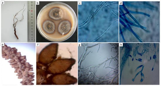 Morphological characteristics of O. lanpingensis: the fresh specimen (a), colonies (b), asci- and ascospores (c,d), fertile part and perithecia (e,f), and mycelia and conidia of O. lanpingensis (g,h).