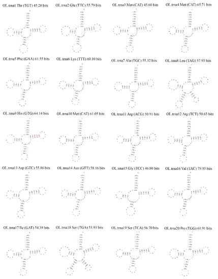 tRNA genes are useful as linkers between mRNA and proteins and are involved in the translation process []. tRNAscan–SE, a widely accepted tool for predicting tRNA genes in mitogenomes, was used in this study to predict the tRNA genes in the mitogenome of O. lanpingensis. A cloverleaf representation of each tRNA was obtained, and 20 tRNAs were found, which, through rough clustering estimation, were divided into two groups of 14 amino acids within the range of 70 to 84 bp in length. The output showed that, among the predicted tRNAs, few were found in the form of multiple copies; the trnM-CAT gene for methionine presented three copies, while the rest of the determined tRNA structures showed only one copy, as shown in Table 5 and Figure 4.