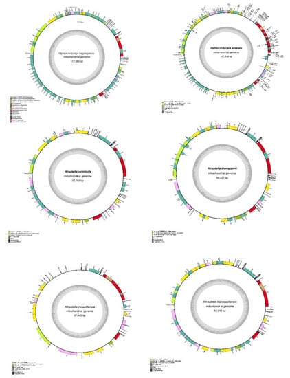 - Bernt, M.; Donath, A.; Jühling, F.; Externbrink, F.; Florentz, C.; Fritzsch, G.; Pütz, J.; Middendorf, M.; Stadler, P.F. MITOS: Improved de novo metazoan mitochondrial genome annotation. Mol. Phylogenet. Evol. 2013, 69, 313–319. [Google Scholar]