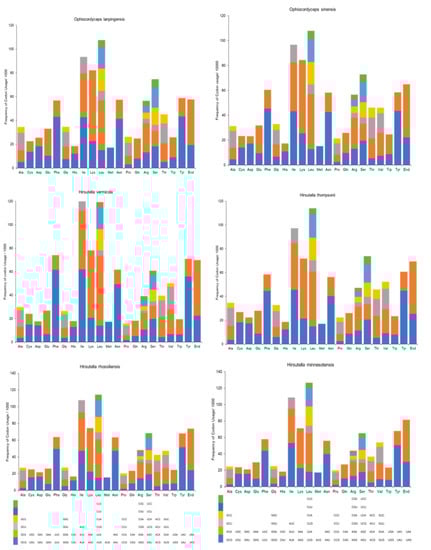 Next, the CU analyses of the six mitogenomes, which are shown in Figure 6, were compared. Leucine was the most frequently coded region, followed by isoleucine and lysine. However, O. lanpingensis and O. sinensis clearly exhibited similar patterns of CU frequency compared to the other four mitogenomes.