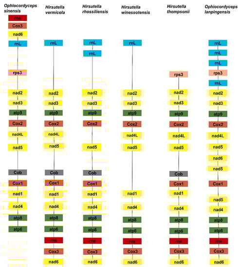 Synteny analysis indicated that the six Ophiocordyceps mitogenomes were divisible into different homologous regions, where the sizes and relative positions of these regions were highly variable (Figure 8). The locations and sizes of these homologous regions varied among the six mitogenomes. In Figure 8, the homologous regions are connected via colored lines, which in turn connect the six mitogenomes, whereas black bar boxes show the genes with similar orders and sequence conservation among the six mitogenomes. Gene order and synteny analysis revealed that 13 genes were conserved across 6 mitogenomes. Meanwhile, the gene orders of O. lanpingensis and O. sinensis were highly conserved compared to the other four species.