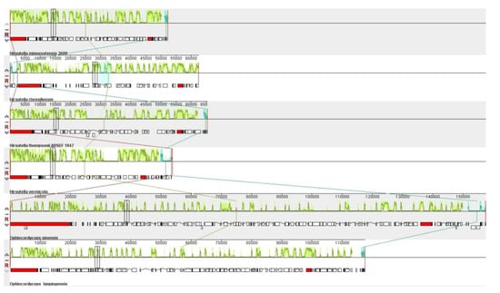 - Darling, A.C.E.; Mau, B.; Blattner, F.R.; Perna, N.T. Mauve: Multiple alignment of conserved genomic sequence with rearrangements. Genome Res. 2004, 14, 1394–1403. [Google Scholar]