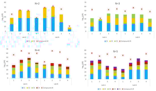 Conditional and simple LRs were assigned in DBLR™ (https://strmix.com/dblr/, accessed on 1 September 2022) for the 32 mixtures from Lab A and B. Sub-source LRs were assigned conditioning on the presence of each POI in turn. The conditional LRs were built sequentially depending on the number of contributors in the mixture. A derivation of the compound LR using conditional and simple LRs is given in Appendix B. For example, for a two-person mixture with two POIs, the compound LR can be written as the product of a conditional LR and a simple LR: