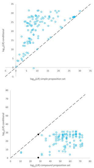 A plot of the log10(LR) assigned for the mixtures using compound propositions versus log10(LR)s for the conditional propositions is given in the bottom pane of Figure 2. The LRs assigned given conditional propositions were smaller than the LRs assigned using compound proposition sets. The data points at [~28, ~0] and [~28, ~27] and indicated as filled data points in Figure 2 are considering two different POIs contributing to the same mixture. The major is (almost) fully resolved, whereas the minor is very ambiguous. The major carries the minor in the log10(LR) considering compound propositions. When conditioning on the major (in the approximation of exhaustive propositions), no information is gained in relation to the minor’s genotype. Vice versa, when conditioning on the minor, no information is gained in relation to the major’s genotype.