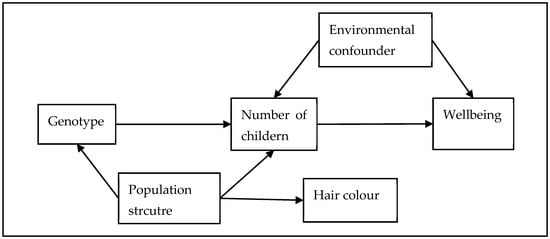 We used two sets of negative control outcomes to explore two potential sources of confounding. Firstly, hair colour is known to vary by ancestry in the UK/European population, but prima facie should not have a direct causal relationship with the number of children we have [56]. It can therefore be used as a negative control outcome for population structure (see Figure 1 for a visual representation). Secondly, wellbeing may be affected by our developmental environment. However, the number of children we have is affected by our parental genotype (through inheritance). The parental genotype will also influence our developmental environment because of the effects that the parental genotype will have on the parental phenotype and therefore on the developmental environment (i.e., through genetic nurture, see Figure 2 for a visual representation). To test if genetic nurture is a residual confounder, we used the number of siblings as a negative control outcome. The number of siblings an individual has is caused by parental genotype but is unlikely to be caused by the number of children that the individual has. Therefore, the most likely explanation of an MR association with number of siblings is residual confounding due to genetic nurture. We ran the negative controls only using an IVW estimator because it is the most efficient estimator and thus the most likely to detect an association if there is one. In addition, we wanted an estimator which was not robust to pleiotropy because a pleiotropic association between the genetic instrument and the negative control outcomes (i.e., which is not mediated by number of children) is still evidence of an association between the instrument and a confounder of the instrument–outcome association, and hence a violation of the independence assumption.