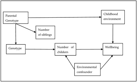 All data that were used in this study are publicly available from the MRC-IEU OpenGWAS platform from the following links: UKB number of children—https://gwas.mrcieu.ac.uk/datasets/ieu-b-4760/ (accessed on 1 January 2023), SSGAC wellbeing—https://gwas.mrcieu.ac.uk/datasets/ieu-a-1009/ (accessed on 1 January 2023), and WFC wellbeing—https://gwas.mrcieu.ac.uk/datasets/ieu-b-4851/ (accessed on 1 January 2023). The R code used in the manuscript is available from https://doi.org/10.17605/OSF.IO/BTPH9.