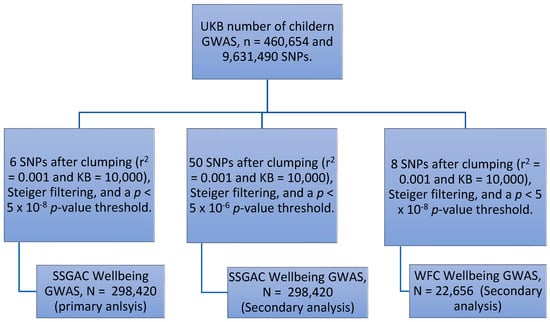 We performed a two-sample MR analysis to explore the lifetime effect that children have on parental wellbeing. Specifically, we used the UK Biobank (UKB) as a source of genetic instruments [36,37], as well as their weights, for the number of children an individual has, and we used the 2016 Social Science Genetics Consortium (SSGAC) Genome Wide Association Study (GWAS) meta-analysis of subjective wellbeing as a source of instrument–outcome associations [38].