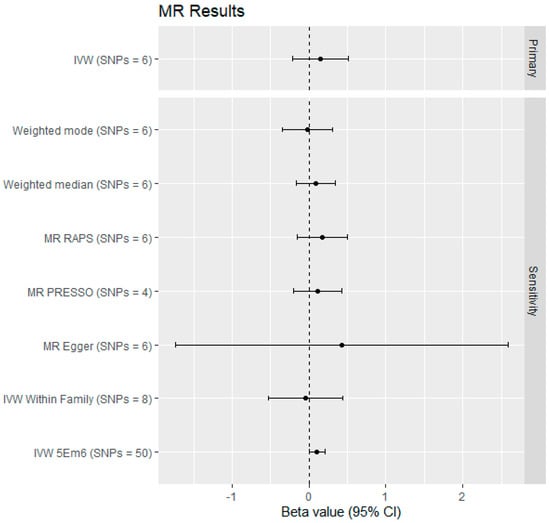 The standard error of the IVW estimate when using a 5 × 10−6 threshold was more than three times smaller than when using the more traditional 5 × 10−8 threshold. Supplementary Table S4 presents the results of this sensitivity analysis for all estimators. MR-RAPS in particular, as a weak instrument robust estimator, still did not find strong evidence against the null hypothesis (β = 0.082, SE = 0.054, p = 0.134).