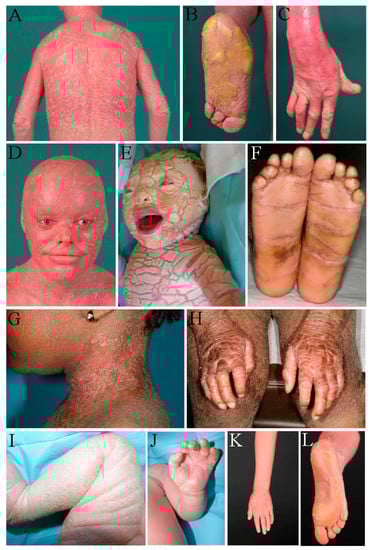(A–D) Harlequin ichthyosis in patient 36. (A) Generalized dry and red scaly skin on the back, (B) palmoplantar hyperkeratosis, (C) joint contractures at fingers and thickened fingernails, and (D) face with red, scaly skin, ectropion, and hypoplastic ears. (E) Harlequin ichthyosis in patient 26 at the day of birth. Large thick plates separated by deep cracks. Ectropion, eclabion, hypoplastic nose and ears. (F–H) Lamellar ichthyosis in patient 48. (F) Palmoplantar hyperkeratosis, (G) ichthyotic skin on the neck, and (H) skin with large dark scales and contractures of fingers. (I–L) Congenital ichthyosiform erythroderma in patient 26. (I) Thickened skin with white scales in a newborn, (J) erythroderma of the palms, (K) generalized erythroderma with fine white scales, and (L) palmoplantar hyperkeratosis.