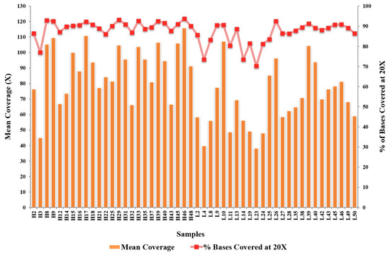 The mean depth of WES for the 50 samples sequenced was 79.19×, with 87.64% of the exome covered at ≥20×. Figure 1 shows the statistics for the coverage of each sample. All samples passed the minimum 30× mean coverage, and 70% of the target regions were covered at 20× after we had removed duplicates. We identified five novel variations among the tier 1 genes: four frameshift deletions (LDLR: 1, PCSK9: 1, LDLRAP1: 2) and one non-frameshift substitution in PCSK9. In addition, 11 known variants were identified (non-synonymous mutations: four in APOB (rs376602710, rs1333175181, rs746414462, rs533617), six in LDLR (rs760436036, rs879254597, rs773658037, rs879254424, rs144172724, rs368708058), one in PCSK9 (rs794728683)) (Table 2). These variants were identified only in the HLDL participants, suggesting that hypercholesterolemia in these patients could be due to genetic factors. Impact prediction of non-synonymous single-nucleotide variants at protein level revealed that seven mutations were damaging (APOB: p.A467G, p.T1222I, p.R1599H, p.H1923R; PCSK9: p.R215H; LDLR: p.E58G and p.E101K) and four were possibly damaging or tolerated. Based on the ClinVar database, five variants were pathogenic/likely pathogenic, two variants had conflicting pathogenicity, one variant was of uncertain significance, and one variant was benign/likely benign. Table 2 lists the variants identified in the tier 1 genes. Only 13 of the 25 HLDL participants carried tier 1 variants, and the number of samples per variant was relatively small.
