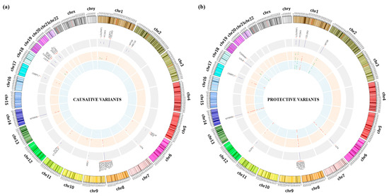 (a,b) Circus plot of the risk-increasing and -reducing variants identified through WES.