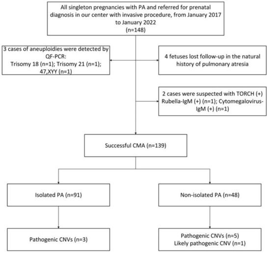 Considering our results relating to chromosomal imbalances, we found that 22q11.2 microdeletions are particularly common in PA fetuses. Among the nine pathogenic CNVs detected in our cohort, four (44.44%) involved 22q11.2 microdeletion syndrome. In addition to this, 22q11.2 microdeletion syndrome; trisomy 21, 18, and 13; and Turner’s syndrome are chromosomal imbalances commonly found in clinical practice and are common chromosomal imbalances in CHDs. Furthermore, 22q11.2 microdeletion syndrome is the most common microdeletion syndrome, although its gene-fragment deletion size is about 1.5–3.0 Mbp [22]. Additionally, 22q11 microdeletion syndrome mainly manifests as cardiac malformation, a cleft palate, hypocalcemia, thymic dysplasia, facial abnormalities, etc. The deleted key gene (TBX1) may be involved in developing the sixth arched artery; it may also be involved in the junction between the peripheral and central pulmonary arteries. Notably, in 80% of cases, the causative imbalance of 22q11.2 microdeletion syndrome is not inherited and is defined as de novo. However, regardless of their sex, affected individuals, in common with patients with an autosomal dominant condition, face a 50% chance of having an affected child in each pregnancy. For this reason, 22q11.2 microdeletion syndrome is a focus of current research [22].