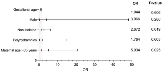 Regression analysis showed that a combination of other structural abnormalities at diagnosis of PA (OR = 2.672, p = 0.019) was the main risk factor for the prediction of chromosomal imbalances in PA fetuses. Figure 2 shows the results of logistic regression analysis for predicting the risk factors of adverse pregnancy outcomes in PA cases.
