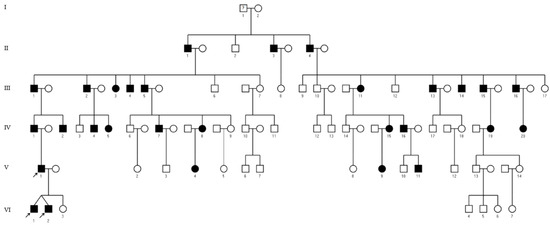 Pedigree with autosomal-dominant SYNS3. Squares and circles indicate males and females, respectively. Roman numerals designate the different generation of the family and latin numerals the individuals in a generation. Affected individuals are indicated by black symbols. Arrows mark the patients described in more detail in this report: patients VI.1., VI.2. and V.1. Information concerning the deceased was not available.