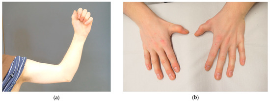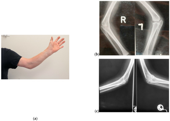 The father (patient V.1.) underwent thumb surgery in childhood and reported a lumbar synostosis. He has a submucous cleft palate. The range of motion of his elbows is limited, with almost complete ankylosis in 45° of flexion and inability to pronate (Figure 4a). He has broad hallux valgus bilaterally, and a hearing impairment is known.