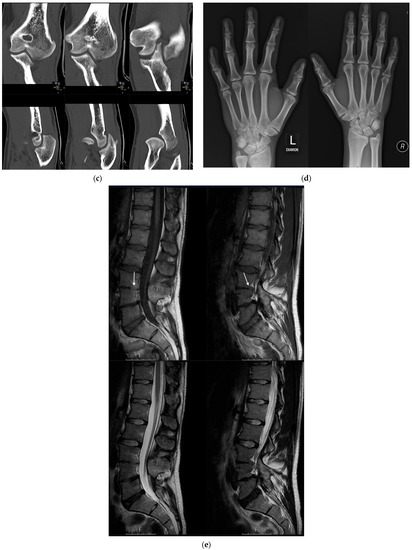 Patient VI.2. (a) Photograph of his feet after surgical correction of hallux valgus: note the broad and still valgus deviated halluces and sandal gaps. (b) The radiographs of the left elbow showed a dysplastic distal humerus with a tiny trochlea and dysplastic olecranon and a dysplastic convex radial head. (c) A computed tomography of the elbow depicted the malformation (upper row: coronal view, lower row: sagittal view). (d) Radiographs of the hands displayed a dysplastic first metacarpal base and head, flattening of the heads of metacarpal 3 and 4 as well as synostosis of the middle and distal phalanges of the fifth fingers. (e) An MRI of the lumbar spine revealed a partial posterior vertebral synostosis marked by arrows of L3 and L4 (upper row: T1-weighted images, lower row: T2-weighted images).