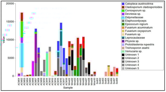 Asbestos-contaminated soil samples were found to contain a mixture of filamentous ascomycete fungi (C, cladosporioides, C. sphaerosporum, E. nigrum, F. acuminatum, F. oxysporum and a species of Neodevriesia), basidiomycete yeasts (Saitozyma podzolica, T. asahii, Vishniacozyma carnescens, and Y. lipolytica), and a filamentous basidiomycete (W. muriae) (Figure 4, Table S1). No lichenized fungi were detected. Bacteria present included Actinobacter johnsonii, Acidovorax facilis, species of Masilia, Rheinheimera, and the actinomycete Arthrobacter (Figure 5, Table S2). No cyanobacteria were detected.