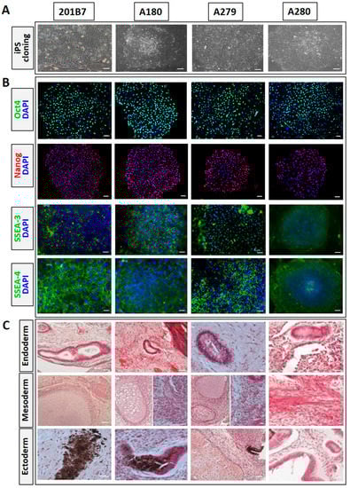 Skin fibroblasts of three patients with mcEDS-CHST14 from the Shinshu University Hospital were harvested for reprogramming. Yamanaka’s four factors were used to reprogram the fibroblasts into iPSCs. Similar to the WT iPSC line 201B7, the iPSC lines established from the three patients (A180, A279, A280) all exhibited the special morphology of pluripotent stem cells, including tightly packed colonies and a high nucleus-to-cytoplasm ratio (Figure 1A). Pluripotency of iPSC clones was confirmed by immunocytochemistry staining for pluripotent markers Oct4, Nanog, SSEA-3, and SSEA-4 in vitro (Figure 1B) and teratoma formation in vivo (Figure 1C). Cells or tissues derived from all three germ layers were found in WT and patient iPSC-derived teratomas.