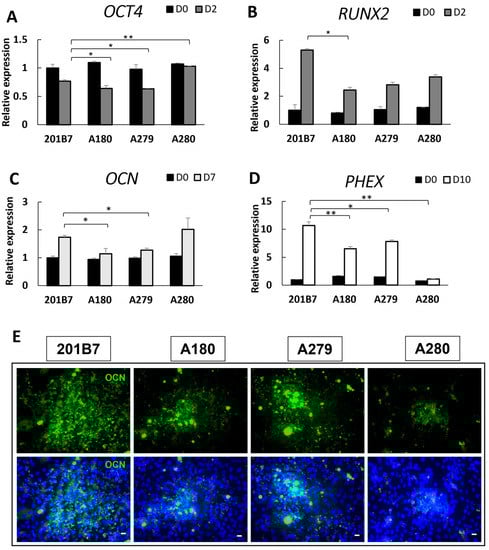 - Zou, L.; Kidwai, F.K.; Kopher, R.A.; Motl, J.; Kellum, C.A.; Westendorf, J.J.; Kaufman, D.S. Use of RUNX2 expression to identify osteogenic progenitor cells derived from human embryonic stem cells. Stem Cell Rep. 2015, 4, 190–198. [Google Scholar] [CrossRef]