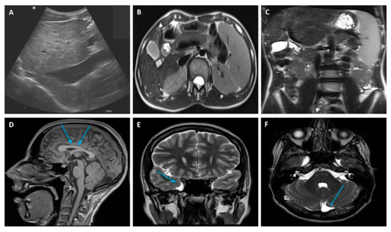 Liver doppler ultrasound (A) and abdominal MRI (B) findings showing hepatic parenchymal micro- and macronodular transformation with associated splenomegaly (C). MRI brain abnormalities: (D) mild hypoplasia of the rostrum and splenium of the corpus callosum, (E) temporo-polar arachnoid cyst, (F) retro-infero-cerebellar arachnoid cyst. MRI, Magnetic Resonance Imaging.