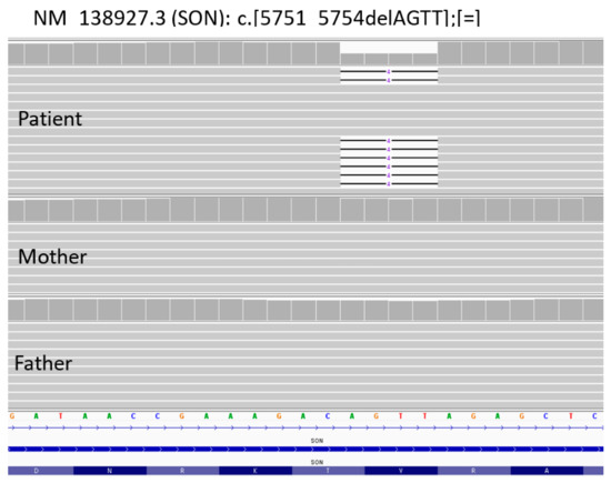 NGS sequencing data from blood samples of the proband and his parents. Identification of de novo variant c.5751_5754delAGTT (p.Val1918fsTer87) in SON gene.