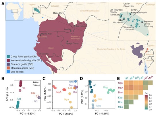 The four subspecies are clearly separated in the principal component analysis (PCA) (Figure 1B and Figure S14), with hair and blood samples from the same subspecies clustering together. PC1 separates the western and the eastern gorilla species, and PC2 separates the western species into WL and CR subspecies.
