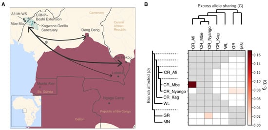 Using Dsuite [56] on the Down10x dataset, we looked at possible gene flow across gorilla species and geographic areas. We ran Dtrios within the Dsuite package to obtain D statistic and f4-ratio values, which are input for F-branch. We ran the F-branch program and its accompanying Python plotting script to generate the matrix displaying excess allele sharing between each branch on the tree and/or its internal branches. First, we ran Dtrios on the species level using the Down10× dataset and one orangutan (Pab-Buschi) from Prado-Martinez et al. [21] as an outgroup. In another iteration, we divided the CR gorilla samples into four groups, each representing a site: Afi, Mbe, Nyango (unknown site), and Kagwene. Finally, to investigate if there are differences in allele sharing across CR sites and WL regions, we grouped several published wild WL gorilla samples into three regions based on their PCA clustering (Figure S13). The regions were the following: the Equatorial Guinea region, with one gorilla for Equatorial Guinea (Ggg-Coco) that clusters with our Monte Alen hair samples; the Naga region, with three samples that cluster around those from Ngaga Camp (Ggg-Carolyn, Ggg-Porta, Ggg-Tzambo), and the Unknown region, including the hair sample of unknown origin (coverage >7×) together with two other previously published samples (Ggg-Akiba-Beri and Ggg-Choomba).