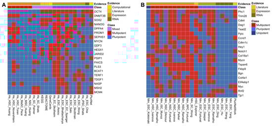 Association of top-scoring genes with stemness signatures. The checkerboards display the association (indicated by red) of genes (rows) with human (A) and mouse (B) stemness signatures. The stemness signatures were classified into signatures for pluripotency, multipotency, unipotency or of mixed potency based on the stem cell types (Supplementary Table S1). Furthermore, the underlying evidence for the stemness signatures is indicated (expression, RNAi, literature curation, computational derivation).