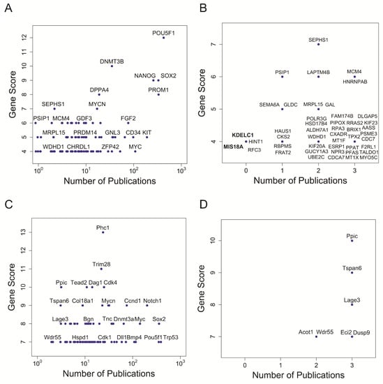 For most genes of the human ISS, we found co-citation with the term stem cell(s) in PubMed (Figure 2A). Notably, ISS genes with the highest score have a substantial number of publications, demonstrating that they have been well studied in the context of stem cell research. For example, the high-scoring master regulators of pluripotency (POU5F1, SOX2, NANOG) were among the genes with the most stem cell-associated publications. However, there are some notable divergences. For instance, SEPHS1, which is involved in the selenium metabolism [47] with a relatively high score of 7, was only associated with stem cells in two publications [50,51] at the time of analysis (Figure 2B). Strikingly, four genes (RFC3, MIS18A, HINT1, and KDELC1) have never been named together with the term stem cell(s) in the title or abstract of PubMed articles at the time of the conducted literature mining (Figure 2B), although they were found in 4 stemness signatures (Supplementary Table S2). MIS18A and KDELC1 are particularly attractive candidates for further study since they never co-occurred with the term stem cell(s) in any part (not even the main body) of a PubMed article. MIS18A codes for a protein essential for the recruitment of the centromere protein A (CENPA) to centromeres, hence being pivotal for normal chromosome segregation during mitosis [52]. Mouse phenotypes associated with MIS18A are Embryo and Mortality/Aging [53]. KDELC1 codes for a protein found in the lumen of the endoplasmic reticulum (ER) containing a motif (KDEL) that prevents its secretion to the outside [47]. Very little is known about the function of KDELC1, although it has been associated with the molecular function of glucosyltransferase, and with the biological processes of carbohydrate and lipid metabolism [54]. We propose that these two genes could be novel players in the context of stem cell biology, and hence good candidates for further experimental studies. Notably, MIS18A was recently independently suggested as a biomarker for leukaemia stem cells based on bioinformatics analysis of the Cancer Genome Atlas [55]. For the mouse ISS, every gene occurred in at least one PubMed reference together with the term stem cell(s) in the title or abstract (Figure 2C,D).