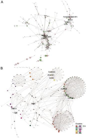 The calculation of betweenness centrality, defined by the number of times each node lies in the shortest path connecting two other nodes divided by the total number of shortest paths, was used for the stringent identification of proteins that are most important for the integrity of the network. We found that MYC has the largest betweenness centrality (Supplementary Table S7) and connects, directly and indirectly, several clusters (clusters A–F and H, Figure 3B). MYC is a proto-oncogene that forms a dimer with the MAX transcription factor, regulating the transcription of genes related to cell cycle progression, apoptosis, and cellular transformation. It is also one of the Yamanaka factors for induced pluripotency [47]. MYC is among the nodes with the highest degree of centrality values, describing the number of nodes with which a node is directly linked. Together with MYC, LCK, and STAT3 are the nodes of the main network with the highest betweenness centralities (Supplementary Table S7). LCK is a proto-oncogene and an important signalling molecule in the maturation of developing T-cells [56], contributing to the hematopoietic system and immune system phenotypes in mice [53], whereas STAT3 is a member of the STAT family of proteins, which mediate cell growth and apoptosis among other processes in response to cytokines and growth factors [57]. Although there are other proteins with higher betweenness centrality, those were found in small isolated clusters and their betweenness centrality values do not reflect node relevance to the overall network (greyed-out proteins in Supplementary Table S7). The proteins corresponding to genes with larger stemness scores, OCT4 (encoded by POU5F1 gene), NANOG, and SOX2, present medium node degree and betweenness centralities (Supplementary Table S7).