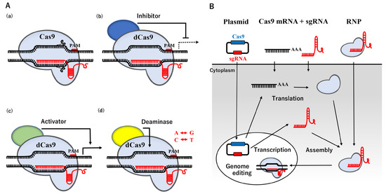 The CRISPR/Cas system, originally found in bacteria and archaea, is an RNA-based adaptive immune system that destroys invading plasmids, phages, and viruses [19,20,21]. The nucleoprotein complex, consisting of three crucial components: CRISPR-coding RNA (crRNA), trans-activating crRNA (tracrRNA), and Cas protein, recognize exogenous DNA and degrade it by endonuclease activity [22], causing error-prone NHEJ. The binding site of Cas9 is located upstream of the protospacer adjacent motif (PAM) containing the 5′-NGG base sequence. Humanized Cas9 protein or Cas9 derived from Streptococcus pyogenes Cas9 (SpCas9), combined with a synthetic single guide RNA (sgRNA) produced by fusing crRNA with tracrRNA, has been shown to trigger DSB in mammalian cells [23,24]. This CRISPR/Cas9 system may be easily designed and prepared for a plasmid vector by changing the sgRNA sequence to a specific region of the genome sequence instead of ZFN and TALEN described above, and its use has rapidly expanded. The recent re-engineering of Cas9 has resulted in the establishment of dead Cas9 (dCas9) with mutations in two nuclease domains, which has extended the application of the CRISPR/Cas9 system with the potential transcriptional inhibitor/activator, and point mutations [25,26,27,28] (Figure 1A).